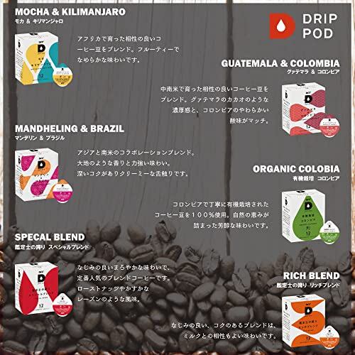 内容:UCCドリップポッド マンデリン&ブラジル、モカ&キリマンジァロ、グァテマラ&コロンビア、有機コロンビア、鑑定士の誇りスペシャルブレンド、鑑定士の誇りリッチブレンド