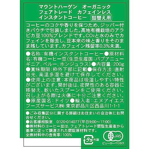 マウントハーゲン オーガニック フェアトレード カフェインレス インスタントコーヒー 詰替用 200g×2個