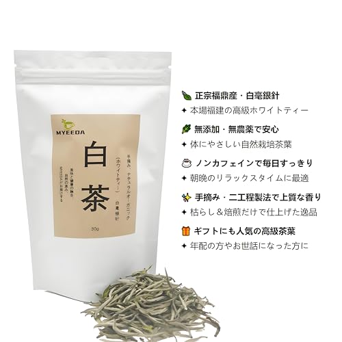 MYEEDA ホワイトティー 白茶 福鼎白毫銀針 高級品お白茶 ノンカフェイン 無添加 無農薬お茶葉 純粋な手摘み 中国茶 抗酸化物質が豊富 健康茶 White Tea ギフト 30g (白毫銀針30)