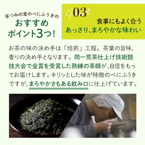 【食事にもよく合う飲み口】お茶の味の決め手は焙煎工程。同一荒茶仕上げ競技技術大会で金賞を受賞した熟練の茶師が、自身をもってお届けします。キリッとした味の中にもまろやかさが残ります。