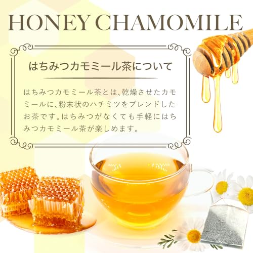 【はちみつカモミール茶とは】乾燥させたカモミールに、粉末状のはちみつをブレンドしたお茶です。はちみつがなくても手軽にはちみつカモミール茶をお楽しみいただけます。また希少なはちみつを使用し、後味の良い優しい甘さが特徴です。