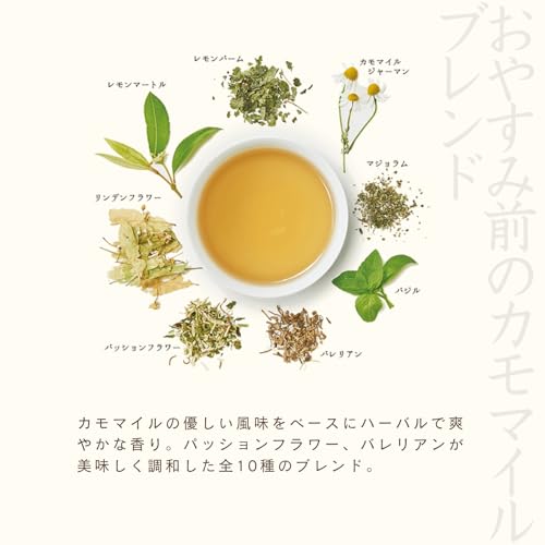 原材料:カモマイルジャーマン(エジプト産)、レモンバーム、レモンマートル、リンデンフラワー、モリンガ、パッションフラワー、マジョラム、バジル、バレリアン、アグリモニー