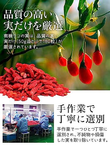 ✅【商品情報】(1)原材料:有機クコの実(厳選規格:50g当たり約180粒の大粒)(2)原産国:中国 寧夏回族自治区中寧市(3)チャック付き袋を使用しているので保存にも持ち運びにも便利。