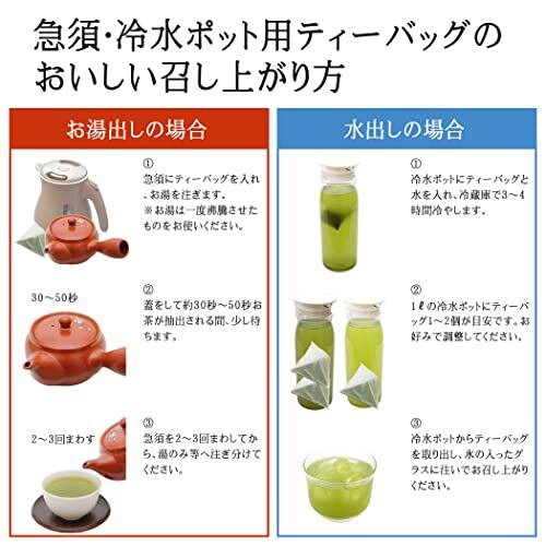 《お湯出し》急須(350~500ml)にティーバッグを入れ、30秒から50秒待ち、急須を2~3回回してから、湯飲みに注ぎお召し上がりください。1個で湯飲み3~5杯程度が目安です。