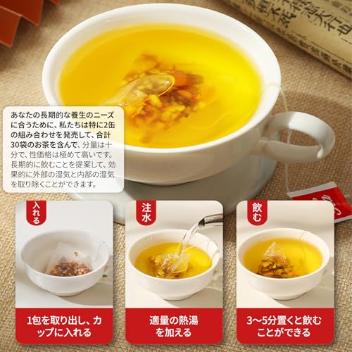 湿気を取り除くには長期的に養生を堅持する必要があり、そのために私たちは特に2缶のお得な組み合わせ(計30袋)を発売し、分量は十分である。独立した三角バッグの設計を採用して、携帯と保存に便利で、高温にも強いです。沸騰したお湯で3 - 5分淹れるだけで、すぐ1杯の色が清らかで、香りが心地よい養生茶を得ることができます。