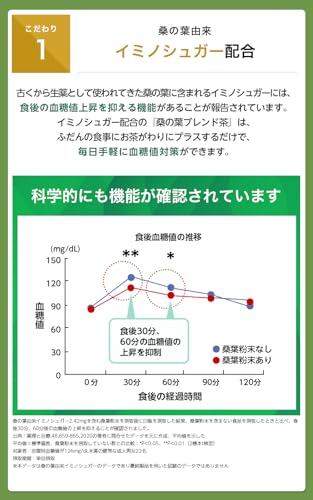 【おすすめする理由1:桑の葉由来イミノシュガー配合】古くから生薬として使われてきた桑の葉に含まれるイミノシュガーには、食後の血糖値上昇を抑える機能があることが報告されています。イミノシュガー配合の『桑の葉ブレンド茶』は、ふだんの食事にお茶がわりにプラスするだけで、毎日手軽に血糖値対策ができます。