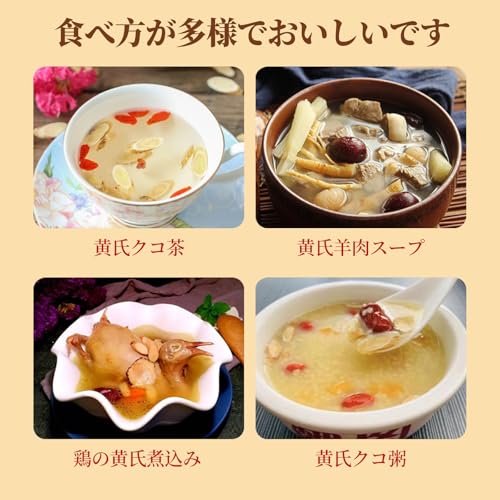 黄氏茶の食べ方はいろいろある。クコ の 実やレッドデーツと一緒に煎じることもできる。 鶏肉と一緒にスープにすると風味豊かで栄養価も高い。 ヤマイモ粥と一緒に朝食にするのも理想的だ。