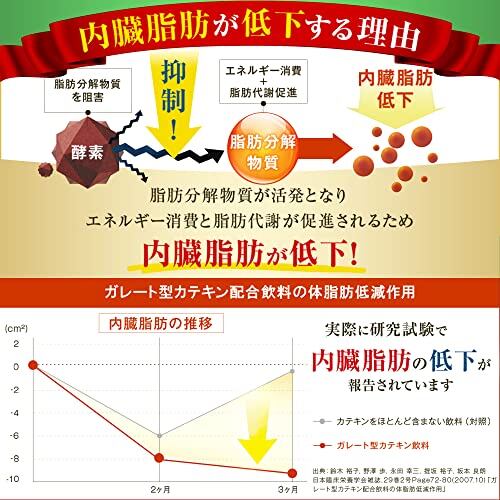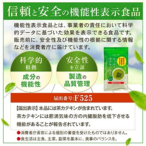 機能性表示食品 届出番号:F525 機能性関与成分:茶カテキン 届出表示:茶カテキンには肥満気味の方の内臓脂肪を低下させる機能があることが報告されています。