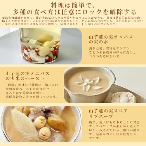铁棍山药は、乳白色を呈し、断面が繊細で、総窒素量は普通の山藥幹の4倍で、水に浸した後の食感は柔らかくてもちもちしていて、山芋の香りがしています;蓮の実は栄養価が高く、栗のような食感と甘みがあります;芡實はほのかな米の香りがして、柔らかくておいしい。これらの食材は単独で入れるだけでなく、おかゆやスープを作る黄金のパートナーでもあり、食卓に多様な風味を添えることができます。
