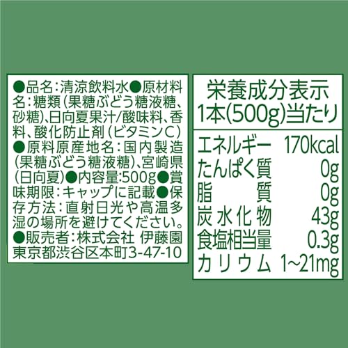 栄養成分(1本(500g)当たり):エネルギー:170kcal、たんぱく質:0g、脂質:0g、炭水化物:43g、食塩相当量:0.3g、カリウム:1~21mg