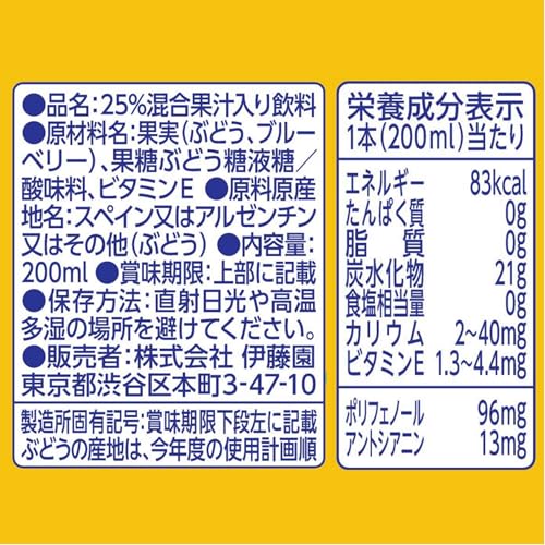 栄養成分(1本(200ml)当たり):エネルギー 83kcal、たんぱく質 0g、脂質 0g、炭水化物 21g、食塩相当量 0g、カリウム 2〜40mg、ビタミンE 1.3〜4.4mg、ポリフェノール 96mg、アントシアニン 13mg