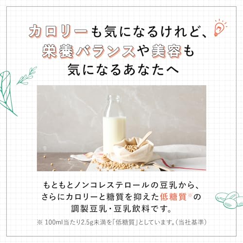 標準的な調製豆乳(日本食品標準成分表2015年販(七訂))に比べ、カロリーを45%抑えました。また、飲み口もすっきりと仕上げ、毎日飲んでも飲み飽きない低糖質調製豆乳です。