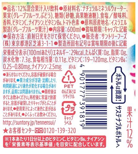 ナチュラルミネラルウォーター、果実(グレープフルーツ、ぶどう)、糖類(砂糖、高果糖液糖)、食塩/酸味料、香料、ビタミンC、ナイアシン、ビタミンB6、トマト色素