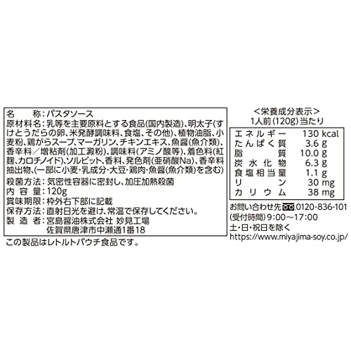 原材料:乳等を主要原料とする食品(国内製造)、明太子(すけとうだらの卵、米発酵調味料、食塩、その他)、植物油脂、小麦粉、鶏がらスープ、マーガリン、チキンエキス、魚醤(魚介類)、香辛料/増粘剤(加工澱粉)、調味料(アミノ酸等)、着色料(紅麹、カロチノイド)、ソルビット、香料、発色剤(亜硝酸Na)、香辛料抽出物、(一部に小麦・乳成分・大豆・鶏肉・魚醬(魚介類)を含む)