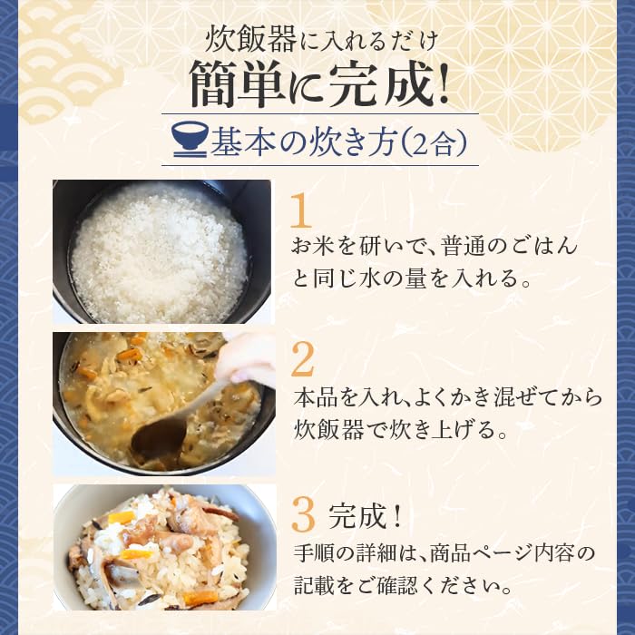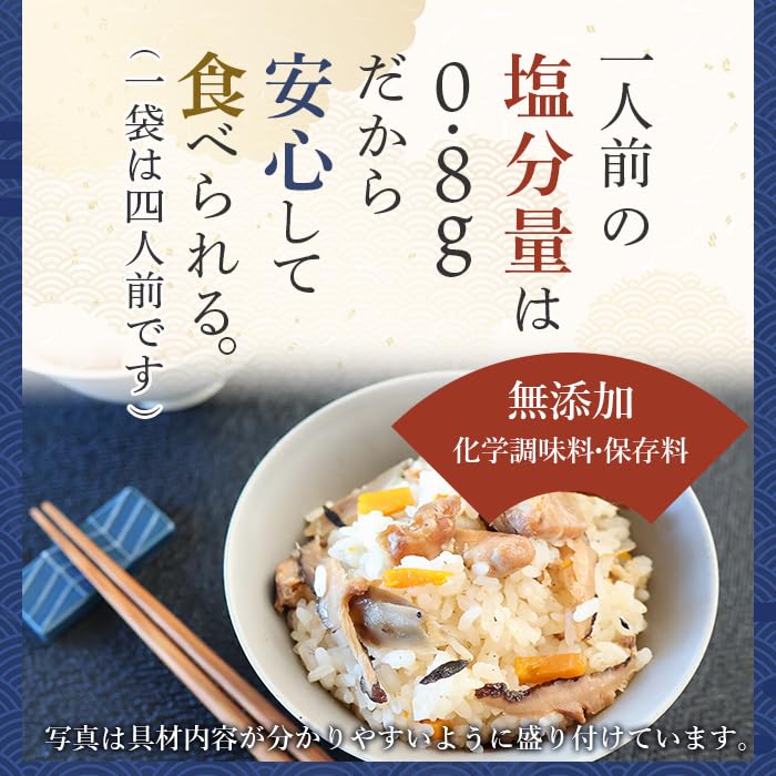 ●厳選した安心の5種(鶏肉・椎茸・人参・ごぼう・ひじき)の国産素材を使った、 具沢山の贅沢な炊き込みご飯の素です。 また1人前の塩分量は約0.8gです。(1袋は4人前)