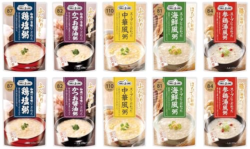 「スープにこだわったお粥シリーズ」3種類と「和風の旨味にこだわったお粥シリーズ」2種類を各2個の10個セットです。