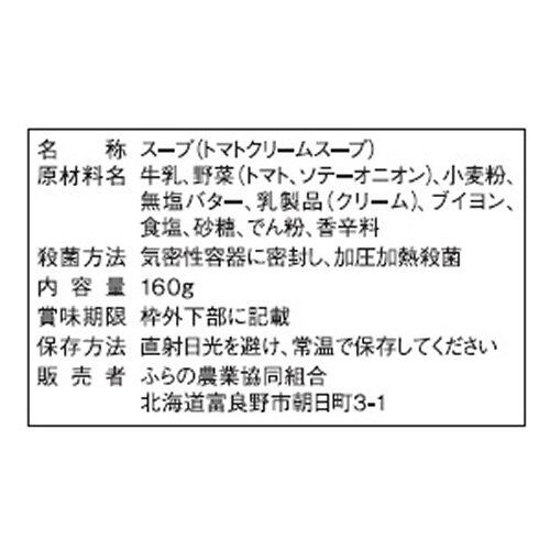 原材料:牛乳、野菜(トマト、ソテーオニオン)、小麦粉、無塩バター、乳製品(クリーム)、ブイヨン、食塩、砂糖、澱粉、香辛料