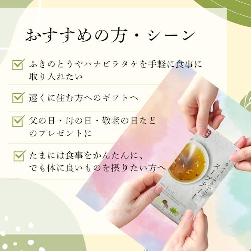 【自然の恵みを贅沢に使用】ふきのとう、ハナビラタケ、昆布、椎茸を使用した、香り高く風味豊かなスープティー。