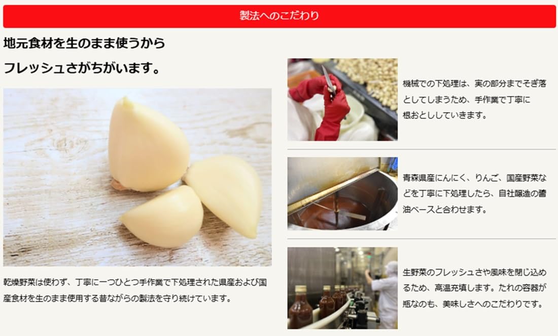 青森県産大豆・小麦100%の醤油をベースに厳選した青森県産のりんごやにんにく、生の野菜を使ったタレです。