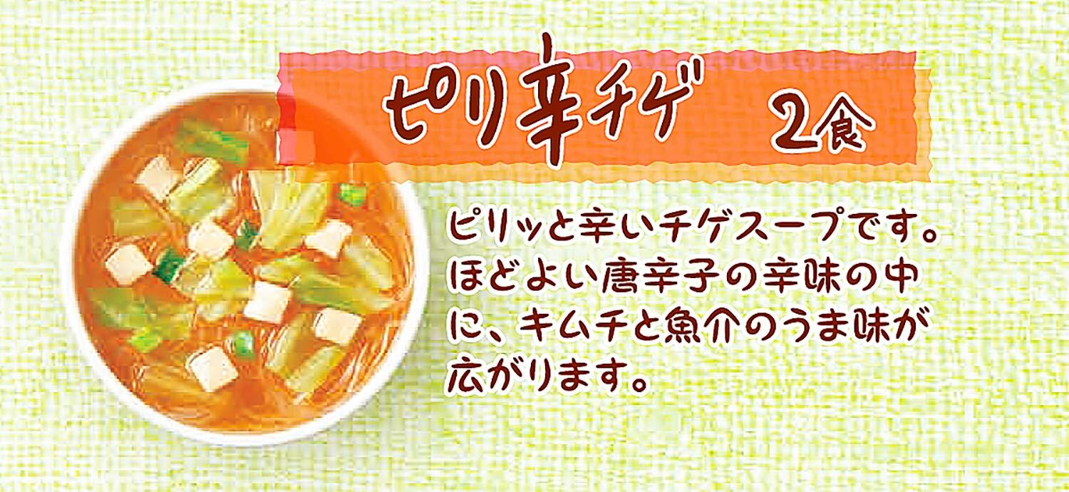 原材料:<春雨>ばれいしょでん粉、緑豆でん粉 <ピリ辛チゲ>乾燥キャベツ、食塩、砂糖、とうふ、香辛料、デキストリン、乾燥ねぎ、還元水あめ、トマトパウダー、粉末みそ、キムチ粉末調味料(白菜キムチエキス、魚醤(魚介類)、デキストリン、香辛料、食塩)、あさりエキスパウダー、オニオンパウダー、粉末しょうゆ、酵母エキス、かつお節粉末/調味料(アミノ酸等)、着色料(カラメル、カロテノイド)、酸味料、凝固剤、酸化防止剤(ビタミンE)、(一部に乳成分・小麦・ごま・大豆・魚醤(魚介類)を含む) <鶏だし中華>乾燥キャベツ、食塩、ごま、デキストリン、砂糖、粉末しょうゆ、わかめ、乾燥にんじん、乾燥ねぎ、酵母エキス、ポークエキスパウダー、香辛料、チキンエキスパウダー、シーズニングオイル/調味料(アミノ酸等)、増粘剤(加工でん粉、グァーガム)、カラメル色素、微粒二酸化ケイ素、香料 (一部に乳成分・小麦・ごま・大豆・鶏肉・豚肉を含む) <まろやか白湯>砂糖、食塩、ごま、粉末油脂、乾燥ねぎ、デキストリン、たんぱく加水分解物、還元水あめ、粉末しょうゆ、香辛料、酵母エキス、チーズパウダー、チキンエキスパウダー、シーズニングオイル、ポークエキスパウダー/調味料(アミノ酸等)、炭酸カルシウム、カラメル色素、微粒二酸化ケイ素 (一部に乳成分・小麦・ごま・大豆・鶏肉・豚肉を含む) <ふんわりかきたま>食塩、鶏卵加工品、デキストリン、乾燥ねぎ、粉末しょうゆ、還元水あめ、卵黄粉末、チキンエキスパウダー、たんぱく加水分解物、粉末ごま油、ポークエキスパウダー、香辛料、シーズニングオイル、野菜パウダー、あさりエキスパウダー/調味料(アミノ酸等)、トレハロース、加工でん粉、微粒二酸化ケイ素、カロテノイド色素、酸味料 (一部に卵・小麦・ごま・大豆・鶏肉・豚肉を含む)