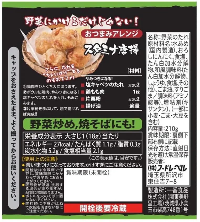 原材料:水あめ(国内製造)、おろしにんにく、食塩、たん白加水分解物、和風調味料(たん白加水分解物、しょうゆ、食塩、その他)、ごま油、すりごま/調味料(アミノ酸等)、増粘剤(キサンタン)、(一部に小麦・ごま・大豆を含む)