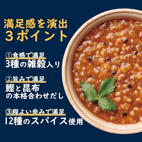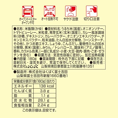 原材料:うるち米(国産)、オニオンソテー、トマトピューレー、米粒麦、発芽玄米(玄米(国産))、カレー風味調味料(砂糖、デキストリン、カレーパウダー、オニオンエキスパウダー、チキンエキスパウダー、粉末油脂、たん白加水分解物、コーンスターチ、その他)、かつお節エキス、しょうゆ、こんぶだし、動物性たん白加水分解物、黒米(国産)、みりん/トレハロース、調味料(アミノ酸等)、香料、カラメル色素、(一部に乳成分・小麦・大豆・鶏肉・豚肉・ごま・ゼラチンを含む)