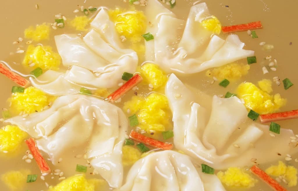 【貝の旨みの中華風スープ】お家で再現するには手間のかかる、貝の旨みが楽しめます。チキンエキスをベースに、あさりとほたての旨みを利かせた中華風スープとなめらかなワンタンがおいしい、ボリュームのあるワンタンスープ。