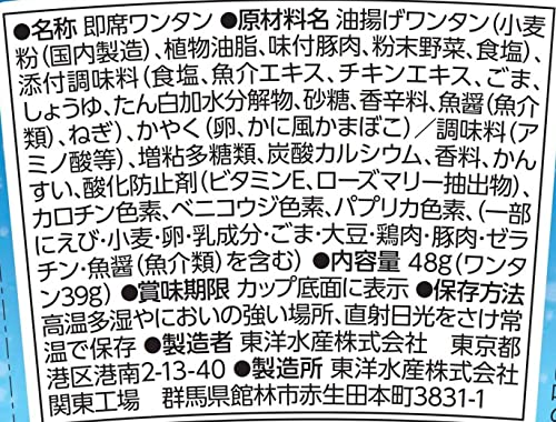 【原材料】油揚げワンタン(小麦粉(国内製造)、植物油脂、味付豚肉、粉末野菜、食塩)、添付調味料(食塩、魚介エキス、チキンエキス、ごま、しょうゆ、たん白加水分解物、砂糖、香辛料、魚醤(魚介類)、ねぎ)、かやく(卵、かに風かまぼこ)/調味料(アミノ酸等)、増粘多糖類、炭酸カルシウム、香料、かんすい、酸化防止剤(ビタミンE、ローズマリー抽出物)、カロチン色素、ベニコウジ色素、パプリカ色素、(一部にえび・小麦・卵・乳成分・ごま・大豆・鶏肉・豚肉・ゼラチン・魚醤(魚介類)を含む)