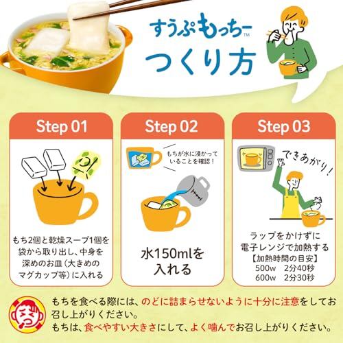 【作り方】おもちと乾燥スープを袋から取り出し、水150mLと一緒にカップなどのお皿に入れます。ラップをかけずに電子レンジで2分40秒加熱してお召し上がりください。