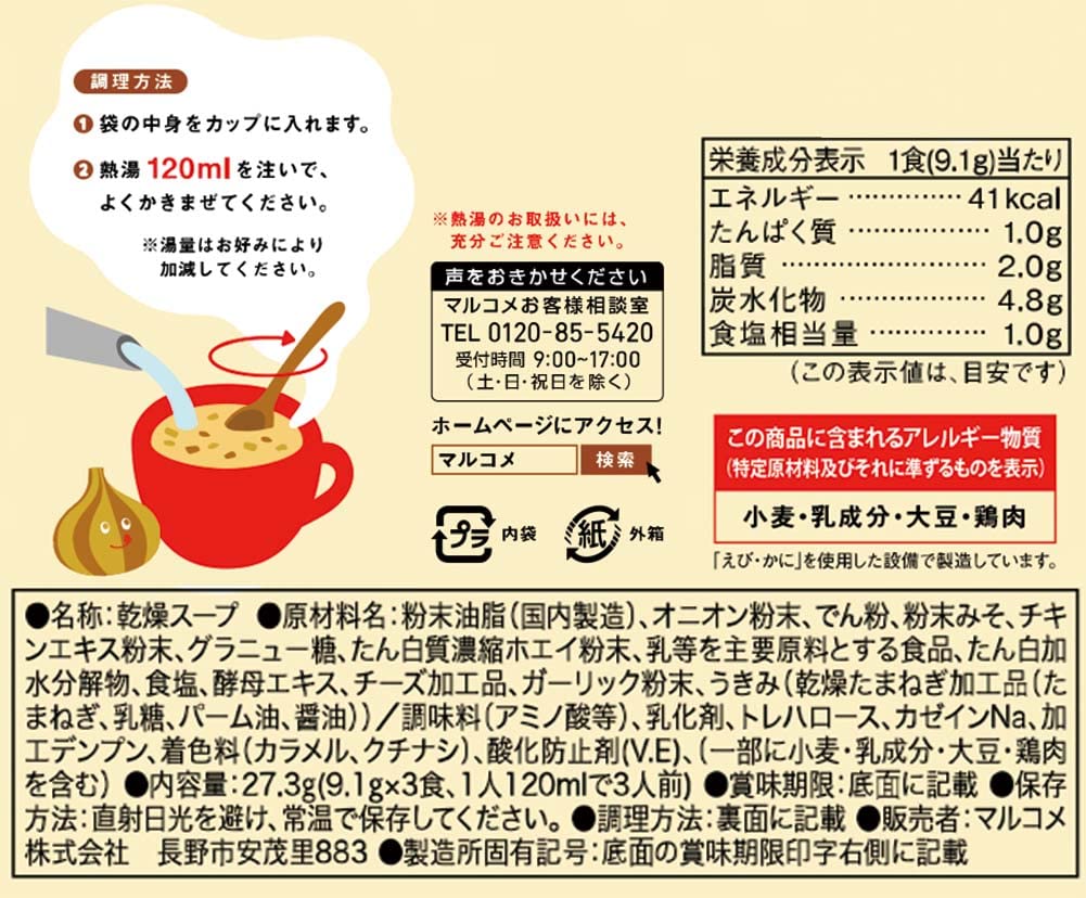 【原材料】粉末油脂、オニオン粉末、でん粉、粉末みそ、チキンエキス粉末、グラニュー糖、たん白質濃縮ホエイ粉末、乳等を主要原料とする食品、たん白加水分解物、食塩、酵母エキス、チーズ加工品、ガーリック粉末、うきみ(乾燥たまねぎ加工品(たまねぎ、乳糖、パーム油、醤油))/調味料(アミノ酸等)、乳化剤、トレハロース、カゼインNa、加工デンプン、着色料(カラメル、クチナシ)、酸化防止剤(V.E)、(一部に小麦・乳成分・大豆・鶏肉を含む)