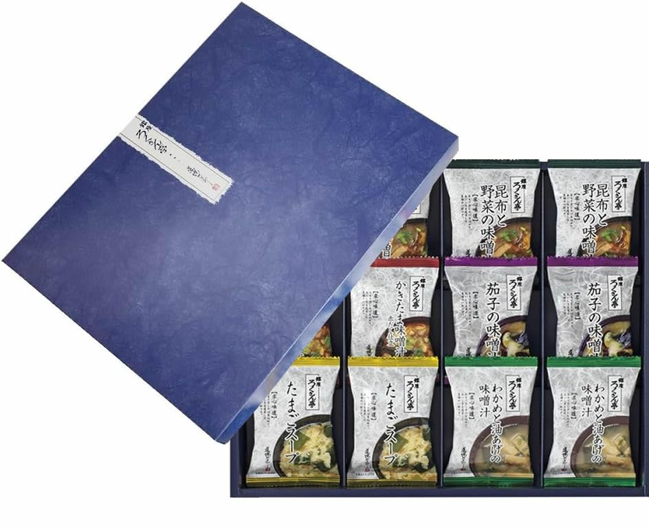 【内容】昆布と野菜の味噌汁×4、かきたま味噌汁赤だし仕立・茄子の味噌汁・たまごスープ・わかめと油あげの味噌汁×各2<br>【箱サイズ】26×32.8×3.1cm<br>【箱入重量】0.31kg<br>【賞味期間】製造日より常温1年<br> 【アレルゲン】卵・乳・小麦<br>※商品のデザイン・内容等が変更になる場合がございます。ご了承ください。