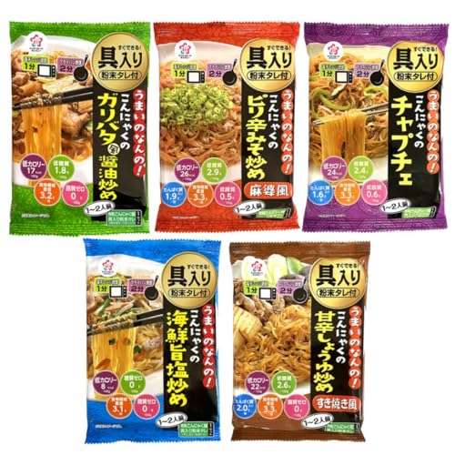 こんにゃく麺「うまいのなんの!」おかずシリーズ5種類×2 【10袋セット】 ガリバタ風醤油炒め、海鮮旨塩炒め、チャプチェ、ピリ辛みそ炒め(麻婆風)、甘辛しょうゆ炒め(すきやき風) 具入り粉末タレ付 レンジで1分 低カロリー 低糖質 低脂質 (10)