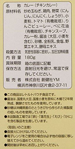 原材料:炒め玉ねぎ(北海道)、鶏肉(青森)、野菜[にんじん(北海道、青森他)にんにく(青森)、しょうが(九州、高知)]、小麦粉(北海道)、トマト(有機栽培:アメリカ)、りんごピューレー(山形、青森)、べに花油(有機栽培:アメリカ又はオーストラリア)、チキンスープ(九州)、カレー粉、醤油(大豆、小麦を含む)、砂糖(沖縄)、全粉乳(北海道)、食塩、野菜エキス、酵母エキス