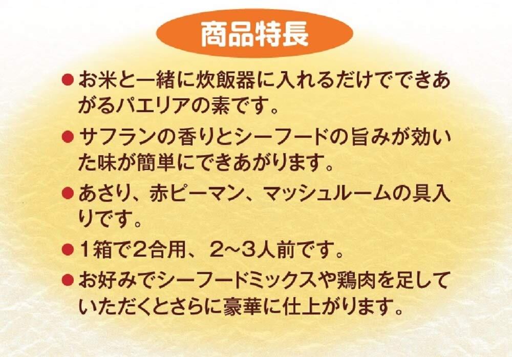 原材料:あさり、野菜(マッシュルーム、赤ピーマン、にんにく)、大豆油、食塩、チキンブイヨン、チキンオイル、えび風味パウダー、ターメリック末、ガーリックオイル(小麦・大豆を含む)、チキンエキス、ホワイトペッパー末、サフラン末/増粘剤(加工でん粉)、調味料(アミノ酸等)、酸味料、香料(えび・大豆を含む)、着色料(パプリカ色素、ウコン)、乳化剤(大豆由来)