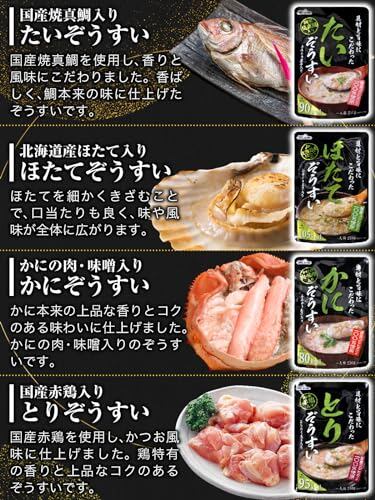 【こだわりの食材を使用】国内産のお米に組み合わせる食材ひとつひとつにこだわりを持って厳選しました。やさしい味つけでありながらも鶏や魚介の旨味を引き出した素材本来の味を楽しめるお粥となっております。ぞうすいシリーズでは特に国産食材にこだわっており、鯛やホタテ、カニなど高級感ある食材を使用し上品に仕上げました。