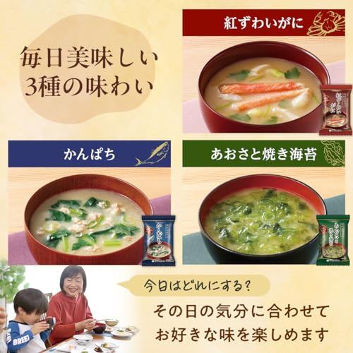 【贅沢な海鮮の旨みと香り】海鮮おみそ汁 かにの旨みが引立つ「紅ずわいがに」、魚介の旨みたっぷりの「かんぱち」、風味豊かな「あおさと焼き海苔」の、こだわり素材を使用したみそ汁3種セットです。