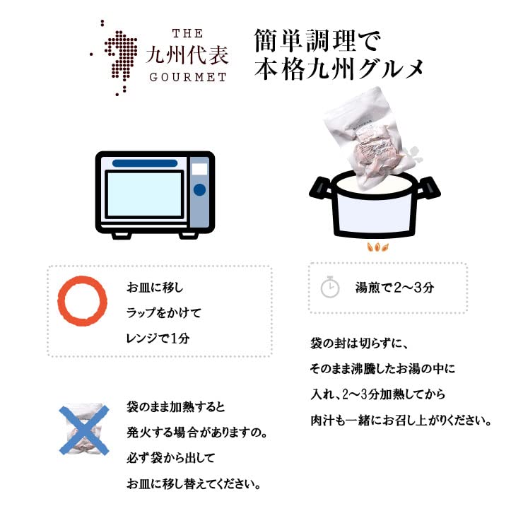 ✅【簡単調理で、本格宮崎グルメ】【電子レンジの場合】袋のまま加熱すると発火する場合がありますので、必ず袋からお皿に移し替え、ラップをかけて1分加熱してお召し上がりください。【湯煎の場合】袋の封は切らずに、そのまま沸騰したお湯の中に入れ、2~3分加熱してから肉汁も一緒にお召し上がりください。