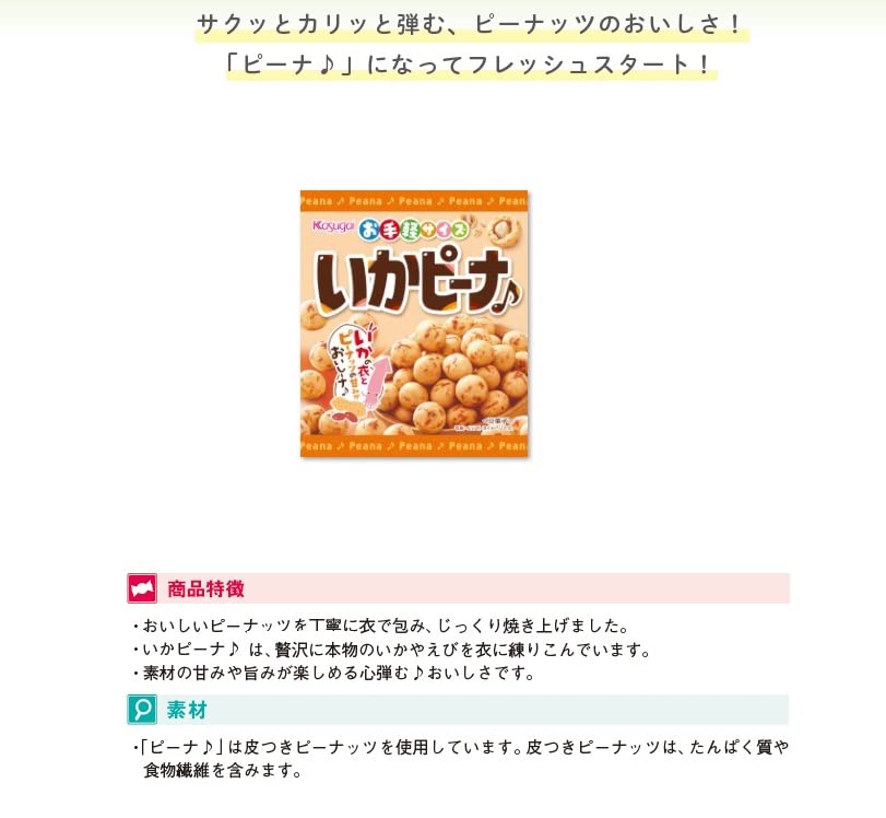 原材料:でん粉(国内製造)、落花生、砂糖、小麦粉、寒梅粉ミックス、食用油脂、いか、食塩、たん白加水分解物、配合調味料/膨脹剤、調味料(アミノ酸等)、(一部に小麦・落花生・いか・大豆を含む)