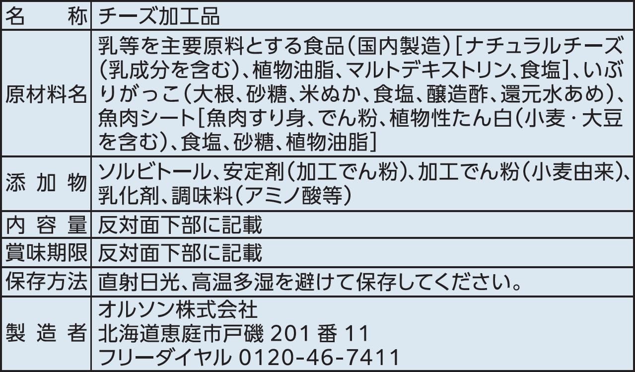 原材料:乳等を主要原料とする食品(国内製造)[ナチュラルチーズ(乳成分を含む)、植物油脂、マルトデキストリン、食塩]、いぶりがっこ(大根、砂糖、米ぬか、食塩、醸造酢、還元水あめ)、魚肉シート[魚肉すり身、でん粉、植物性たん白(小麦・大豆を含む)、食塩、砂糖、植物油脂]/ソルビトール、安定剤(加工でん粉)、加工でん粉(小麦由来)、乳化剤、調味料(アミノ酸等)
