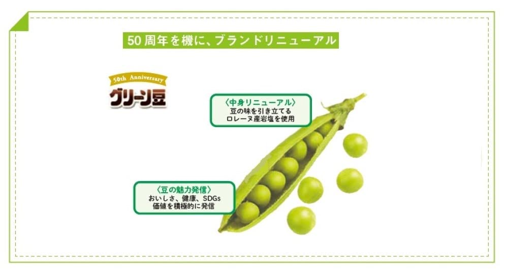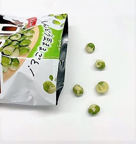 原材料:えんどう豆(輸入)、食用油脂、でん粉、砂糖、小麦粉、食塩、配合調味料/調味料(アミノ酸等)、膨脹剤、着色料(黄4、青1)、(一部に小麦・大豆を含む)