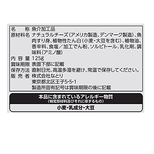 原材料:ナチュラルチーズ(アメリカ製造、デンマーク製造)、魚肉すり身、植物性たん白(小麦・大豆を含む)、植物油、香辛料、食塩/加工でん粉、ソルビトール、乳化剤、調味料(アミノ酸)