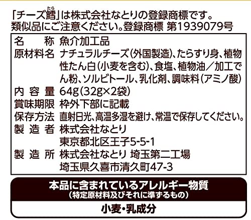 原材料:ナチュラルチーズ(外国製造)、たらすり身、植物性たん白(小麦を含む)、食塩、植物油/加工でん粉、ソルビトール、乳化剤、調味料(アミノ酸)
