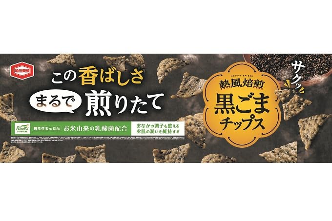 黒ごまを粒ごと練り込んだお米の生地を熱風焙煎製法で焼き上げています。まるで煎りたてのような黒ごまの香ばしさと、サクッとした食感が楽しめます。