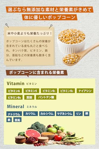 食物繊維たっぷり。栄養が多く含まれる果皮・種皮・胚などの部位を除去しない全粒穀物。爆裂種のポップコーン。