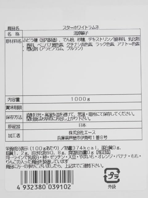 えーきゃん NB 1kg スターホワイトラムネ 約830個[5色のミンツ入り星形ラムネ 酸味のあるサイダー風味]