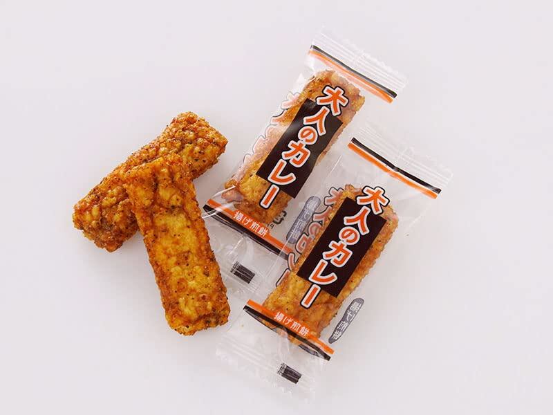 原材料:うるち米(国産)、カレーたれ(砂糖、しょうゆ、水あめ、デキストリン、ウスターソース、香辛料、醸造酢、ホエイパウダー、植物油脂、食塩、風味調味料(かつお)、オニオンエキス)、植物油脂、黒コショウ / 増粘剤(加工でん粉)、調味料(アミノ酸等)、トレハロース、乳化剤、カラメル色素、香料、(一部に小麦・乳成分・大豆・りんごを含む)