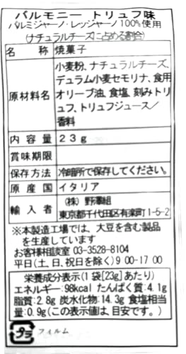 【原材料】小麦粉、ナチュラルチーズ、デュラム小麦セモリナ、食用オリーブ油、食塩、刻みトリュフ、トリュフジュース/香料