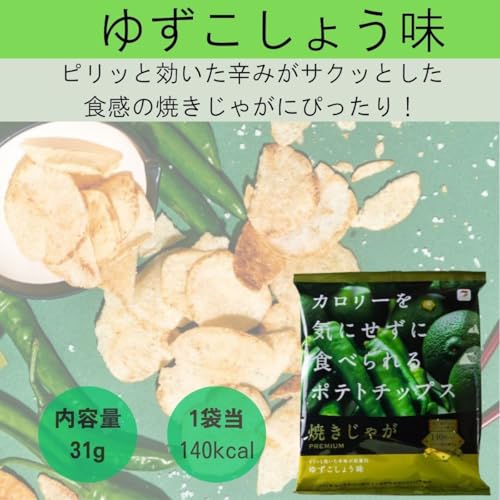 【ゆずこしょう味】:ピリッと効いた辛味が、サクッととした食感の焼きじゃがにぴったり。一枚食べたらまた一枚、やめられない美味しさを、ぜひご賞味ください。