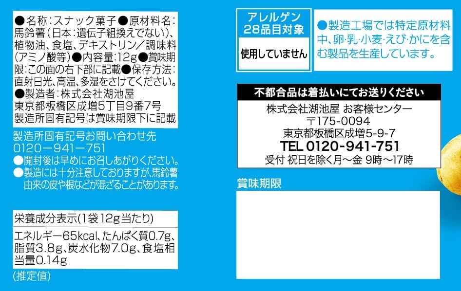 湖池屋のポテトチップスは、国内産のじゃがいも100%で出来ております。
