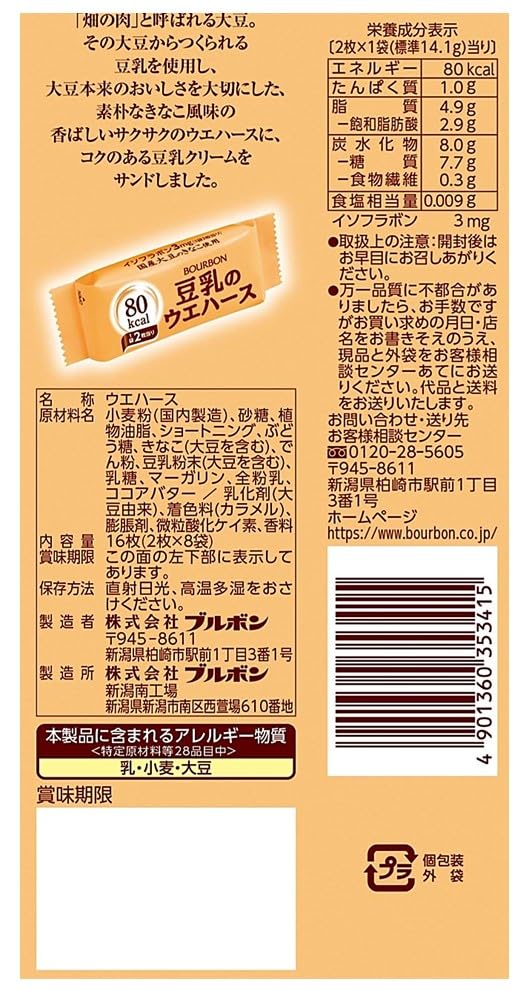 原材料:小麦粉(国内製造)、砂糖、植物油脂、ショートニング、ぶどう糖、きなこ(大豆を含む)、でん粉、豆乳粉末(大豆を含む)、乳糖、マーガリン、全粉乳、ココアバター/乳化剤(大豆由来)、着色料(カラメル)、膨脹剤、微粒酸化ケイ素、香料
